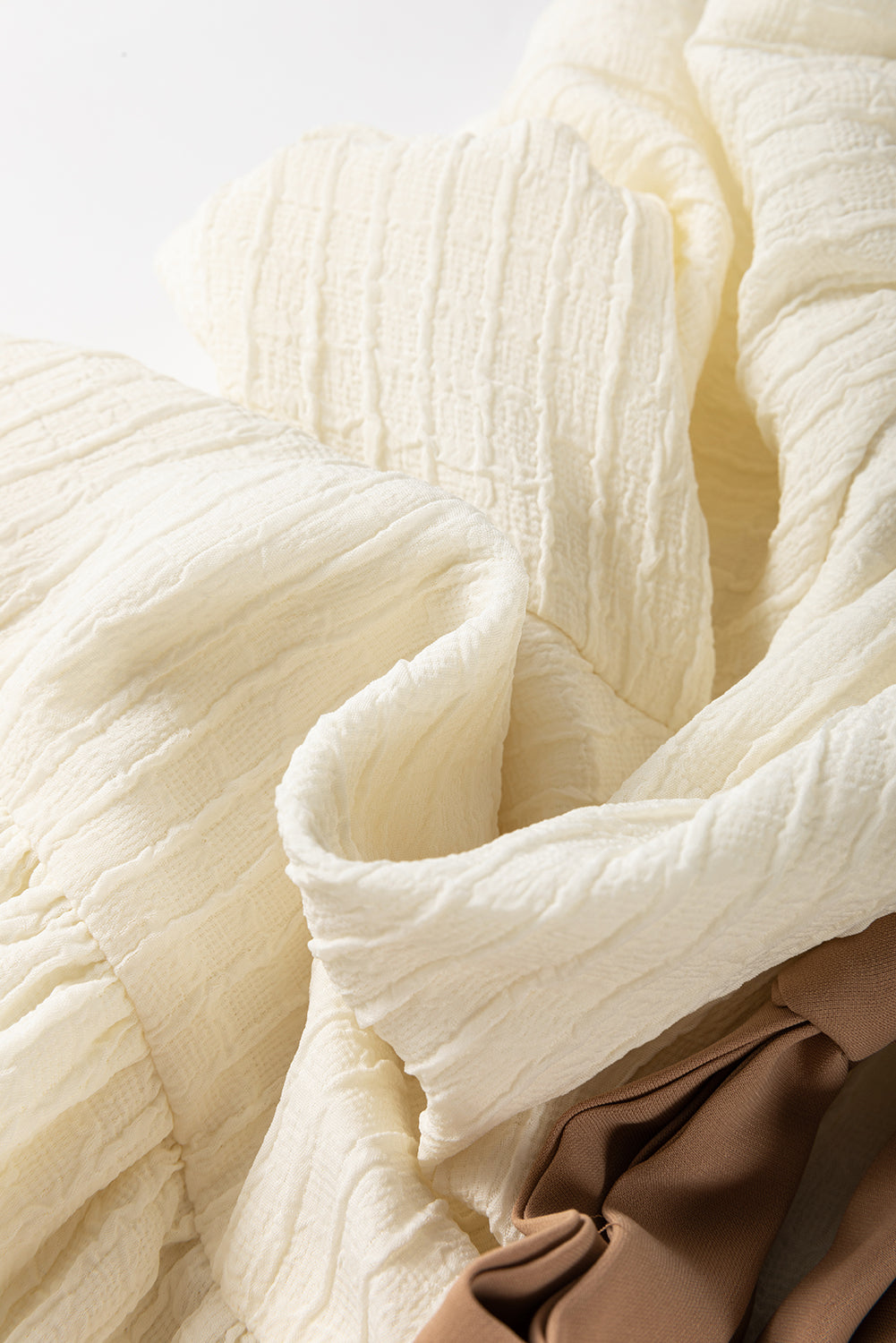 This beige short sleeve blouse brings fun and flair with its charming bow ties and playful puff sleeves. The bubble hem adds a whimsical touch, making it perfect for brightening up any outfit with a light, breezy vibe. Ideal for those who love a stylish mix of cute and casual!
